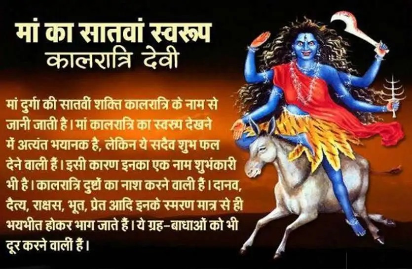 नवरात्रि का सातवां दिन कालरात्रि को समर्पित है, जिन्हें समय की मृत्यु या समय की मृत्यु वाली भी कहा जाता है। वह देवी दुर्गा के सातवें अवतार के रूप में मुक्ति और विनाश का प्रतिनिधित्व करती हैं, और गधे की सवारी करती है। दिन का रंग ग्रे है, जो सूक्ष्मता और रहस्य का प्रतिनिधित्व करता है। यह ब्रह्मांड की विशालता और कठिनाइयों पर काबू पाने की क्षमता का भी प्रतिनिधित्व करता है। इस दिन ग्रे रंग पहनने से सुरक्षा, वैराग्य और परिवर्तन के कालरात्रि आशीर्वाद का आह्वान किया जाता है। यह उन लोगों के लिए भी एक उत्कृष्ट रंग है.